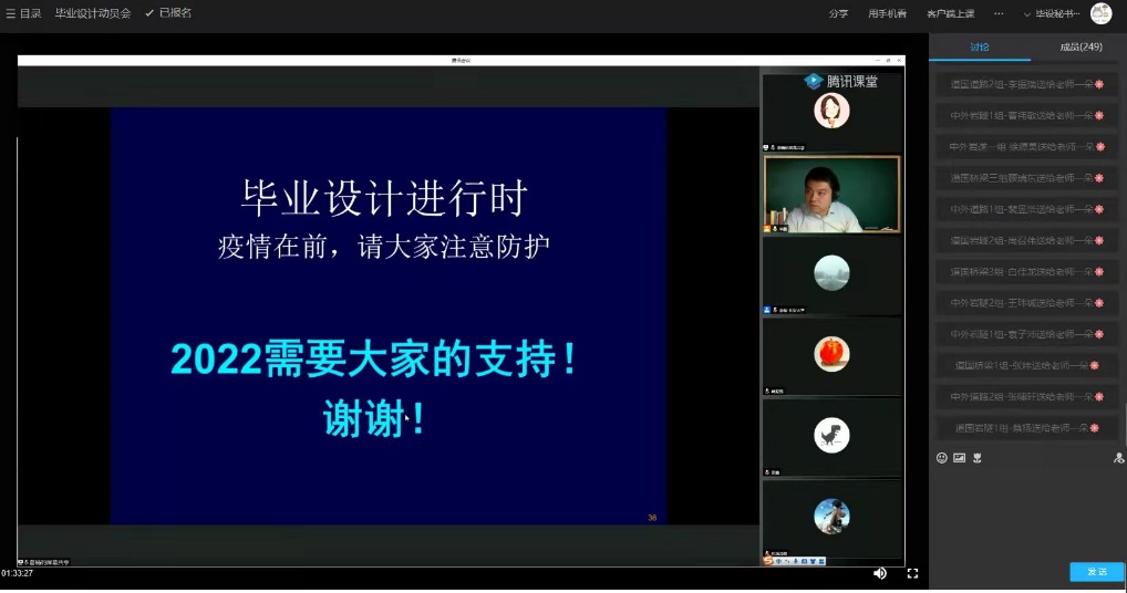 张久鹏在全英文毕业设计(论文)动员中指出,全英文毕业设计(论文)是国际化双语复合型人才培养体系的重要组成部分,是检验学生对本科阶段所学各种知识的综合运用及解决实际问题能力的重要环节,更是学生从校园步入社会的一次演练。今年,国际教育中心首次同步组织道路桥梁与渡河工程专业国际工程班和中外合作办学班的全英文毕业设计(论文),面临“疫情防控特殊时期”“线上指导特殊形式”“不同模式下特殊课程体系”三个特别情况,他希望指导教师克服困难,全力保障毕业设计(论文)质量,希望学生积极发挥主观能动性,为今后发展奠定坚实基础。