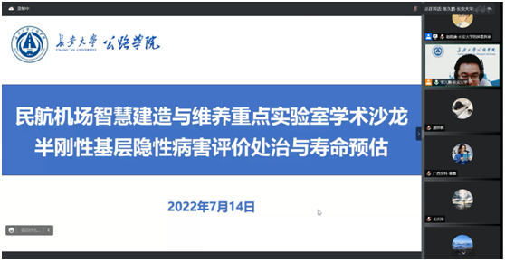 2022年7月14日下午,民航机场智能建造与维养重点实验室成功举办“半刚性基层隐性病害评价处治与寿命预估”线上学术沙龙。西北民航机场建设集团杨凯、圭目机器人有限公司钟新然、广西交通科学研究院王浩、长安大学杨旭、陕西高速机械化工程有限公司成高立等专家学者受邀做主题发言,东南大学、同济大学、长安大学、咸阳机场、福州机场等单位研究人员和技术骨干210余人参加了学术沙龙,学院副院长、民航重点实验室副主任张久鹏教授主持学术沙龙。