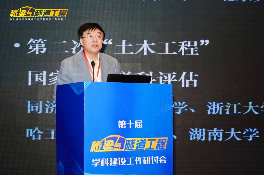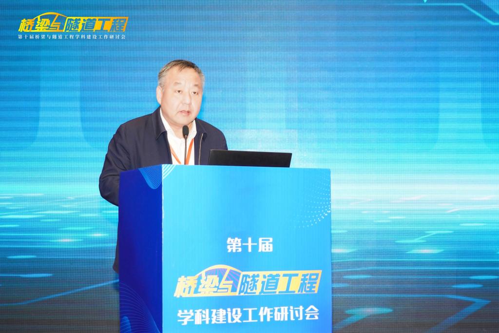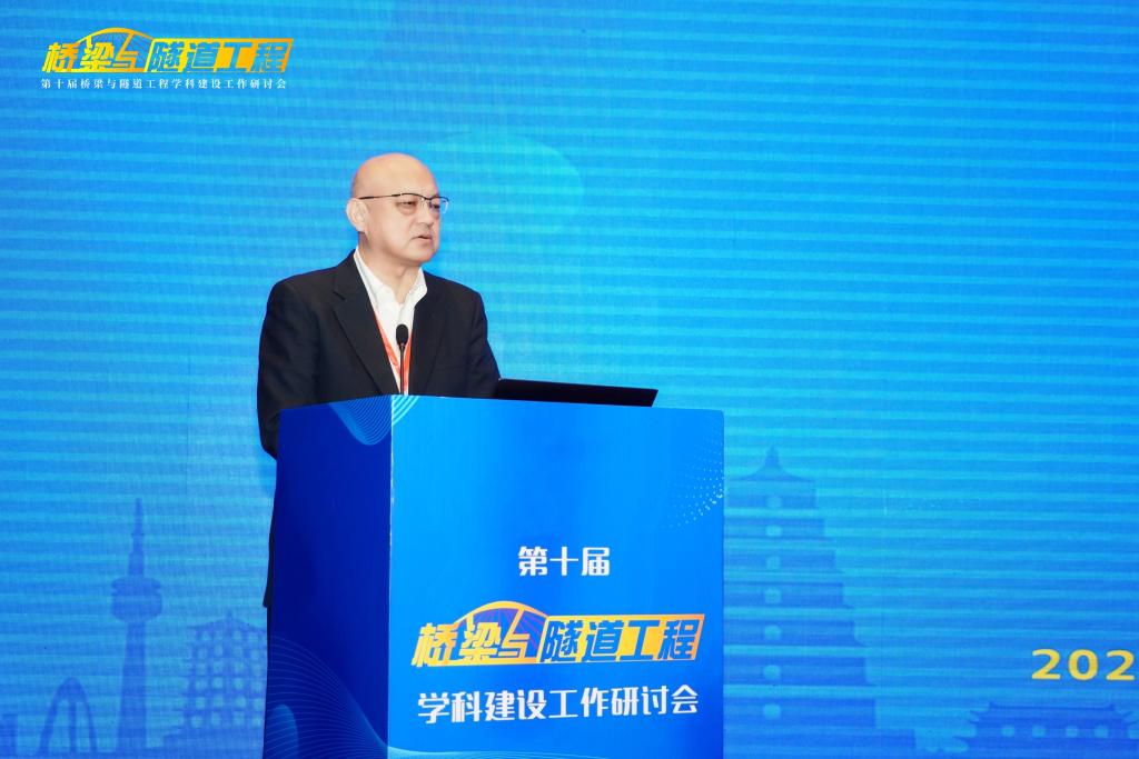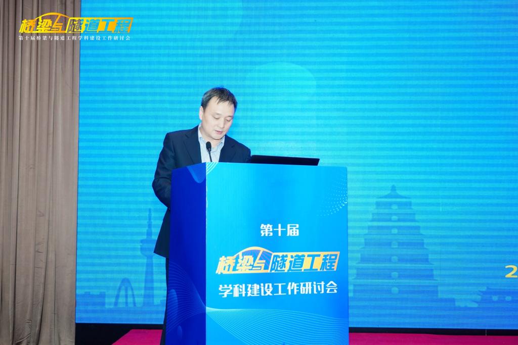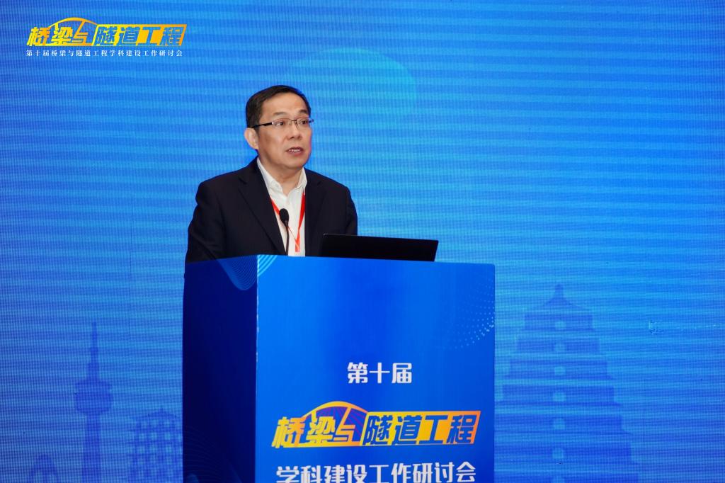 长安大学校长沙爱民教授在开幕式致辞,他对莅临研讨会以及一直关心支持长安大学建设发展的各位专家、来宾、同仁表示热烈欢迎和感谢,并向与会代表介绍了长安大学“桥梁与隧道工程”学科的发展历史、实力与特色。他指出,“桥梁与隧道工程”学科建设需要始终坚持中国特色、世界一流,在党的坚强领导下,坚持服务国家需求,瞄准科技前沿和关键领域,优化学科建设发展布局,把发展科技第一生产力、培养人才第一资源、增强创新第一动力更好结合起来,更好为改革开放和社会主义现代化建设服务。他希望各位与会专家、学者能够以本次研讨会的召开为契机,集思广益、群策群力、凝聚共识,共同提高“桥梁与隧道工程”学科的教学、研究与实践水平。