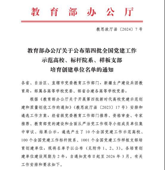 4月16日,教育部思想政治工作司发布《教育部办公厅关于公布第四批全国党建工作示范高校、标杆院系、样板支部培育创建单位名单的通知》(教思政厅函〔2024〕7号),经省级党委教育工作部门推荐、资格审查、专家推荐、教育部党的建设和全面从严治党工作领导小组成员单位集中审议、结果公示,遴选产生了10个全国党建工作示范高校、100个全国党建工作标杆院系、1001个全国党建工作样板支部培育创建单位。汇盈娱乐(中国)官方网站