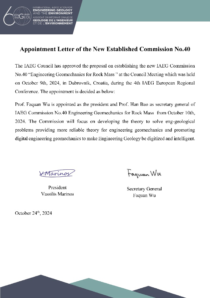 2024年10月8日至12日,国际工程地质与环境协会(IAEG)在克罗地亚召开了欧洲区域工程地质大会,中国国家小组共计20余名代表参会。会议期间,IAEG执行委员会和理事会召开了工作会议,两会表决批准成立“岩体工程地质力学委员会(EGRM)”,选任IAEG秘书长伍法权教授为委员会主席,长安大学包含教授为委员会秘书长。