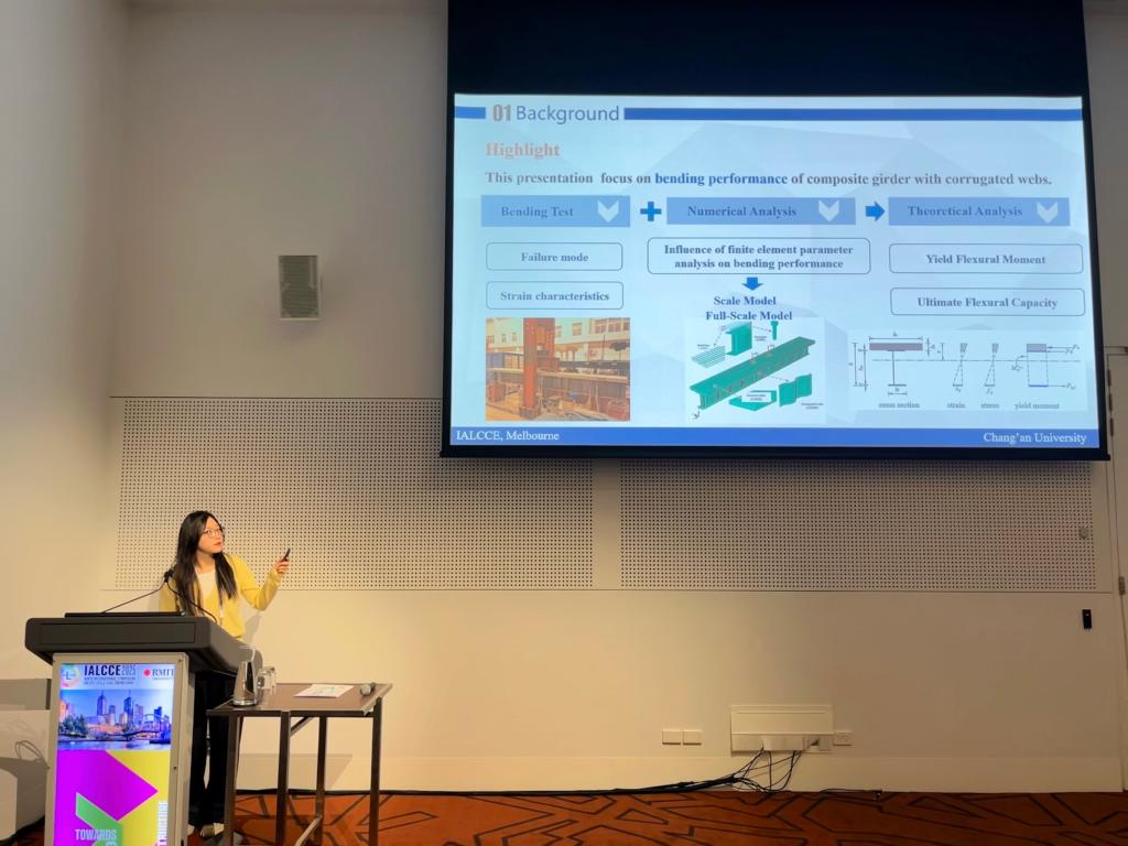 在学术报告环节,王春生教授主持了“Lifecycle Design for Structures and Infrastructure”分会场,并作题为“Study of Thermal Gradient Fatigue Load Model for Flat Steel Box Girder Bridge”和“Mechanical Performance Simulation of Steel-concrete Connection Section of Composite Bridge Tower”的学术报告。段兰副教授报告了题为“Hybrid Connecting Interface Optimization for UHPFRC Composite Steel Bridge Deck”的研究成果。博士研究生李熙作题为“Bending Performance of Composite Steel Plate Girders with Corrugated Webs”的学术报告。通过四个报告系统介绍了团队在桥梁长寿命设计领域的最新进展,受到与会专家关注。