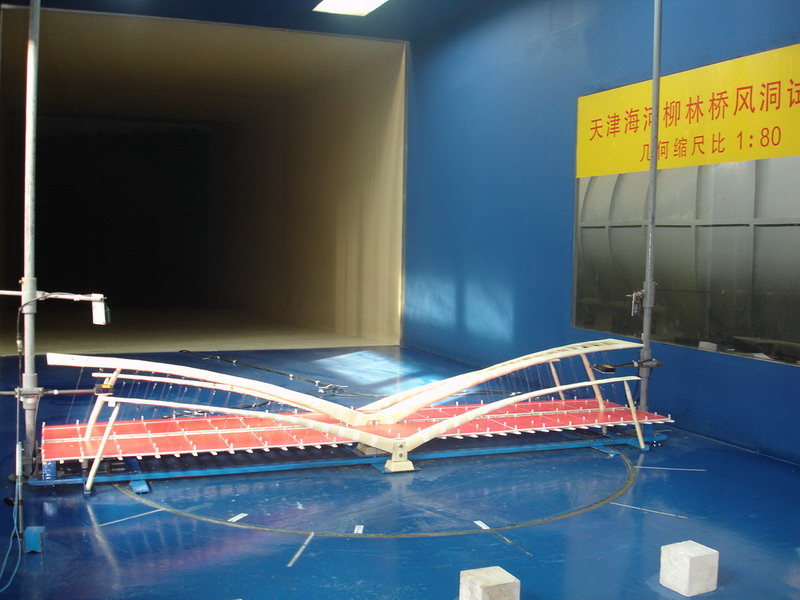 长安大学风洞为回、直流两用构造型式。当风洞回路中5m长可移动段合拢,进气、排气侧门关闭时为回流式风洞,可移动段移开,两个侧门打开时,为直流式风洞,以完成不同内容的试验。风洞试验段设有两个转盘,前转盘直径1.80m,中心距试验段进口2.50m,用于汽车模型试验;后转盘直径2.00m,中心距试验段进口12.50m,用于桥梁模型和建筑物模型的测力和测压试验;α机构中心位于后转台中心前2.34m,通过α机构改变模型的姿态,用于桥梁模型的测力和测振试验。