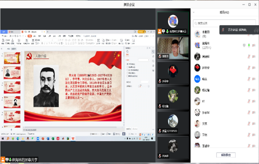 8月9日晚7点,本科生第五党支部通过腾讯会议形式开展了学习教育。由副书记蒋中楷同志主持,五支部全体正式党员及预备党员参与本次党史学习。蒋中楷同志依托经典红色电影《建党伟业》,回顾了中国共产党成立的历史背景与重大意义,重点解读了伟大建党精神并展望了如何在新时期实现中华民族伟大复兴的中国梦的征程上践行伟大建党精神。