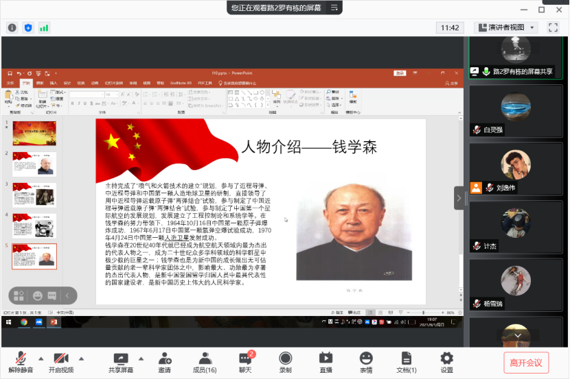 罗有栋同志分享道:钱学森老先生一生默默治学,但无论在什么时代,什么地方,他所选择的,既是一个科学家的最高职责,也是一个炎黄子孙的最高使命。他一生的经历和成就,在中国的国家史、华人的民族史和人类的世界史上,都留下了耀眼的光芒,照亮了来路。作为中国航天事业的先行人,他不仅是知识的宝藏、科学的旗帜,而且是民族的脊梁、全球华人的典范,他向世界展示了华人的风采。
