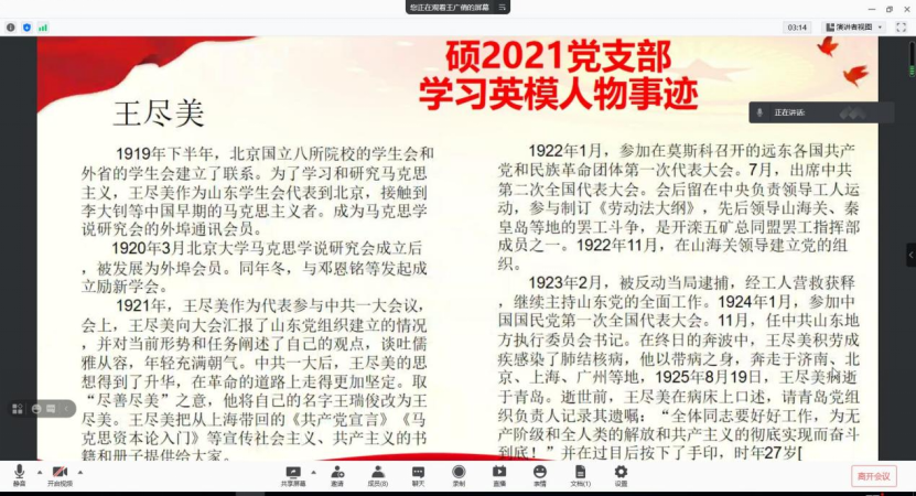 研究生党支部在党委号召下于7月5日以来陆续开展“五个一百”系列学习会议,本次学习教育以学习百名英模人物为主题展开。