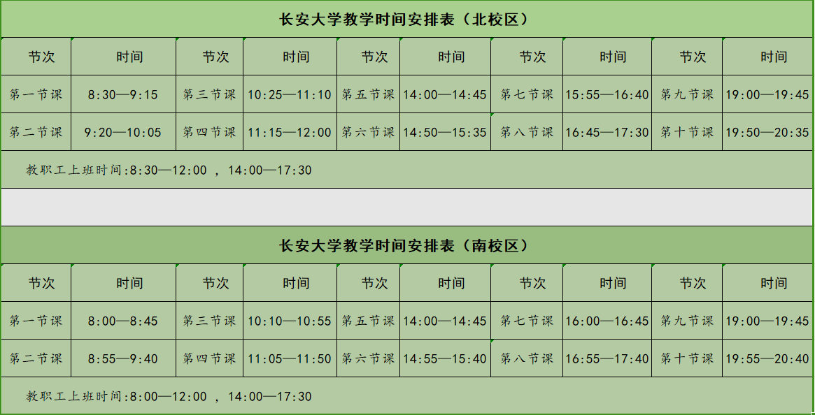 2023年秋季学期执行新的《长安大学2023年秋季学期教学时间安排表》,取消原有的“错峰上课”时间安排。教学时间安排表如下,请遵照执行。另附《长安大学2023-2024学年校历》。