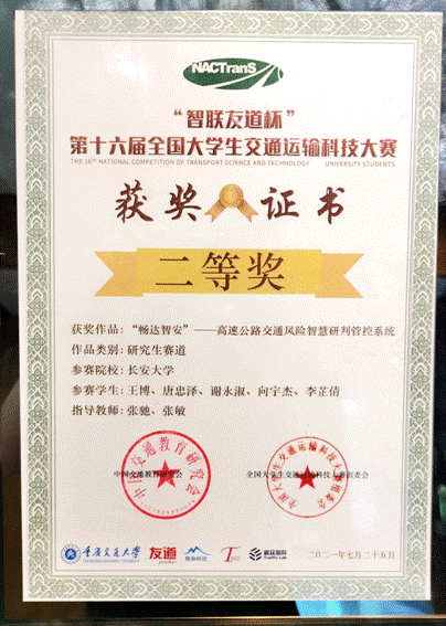 The National College Students Transportation Science and Technology Competition takes transportation science and technology problems as the carrier to cultivate college students' scientific spirit and scientific accomplishment, the ability to discover and solve problems and the spirit of teamwork, and promote the development of transportation science and technology. The success of this competition reflects the in-depth exchange and innovative thinking of our teachers and students on the existing problems in the industry. The teachers and students of our college will continue to work hard to make contributions to the major strategy of strengthening the country by transportation