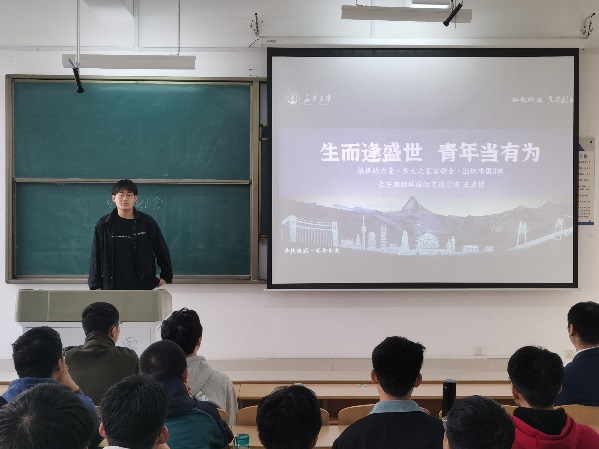 来自都柏林国际交通学院的王彦博学长以“生而逢盛世、青年当有为”为主题做了经验分享。王彦博以加权第一的成绩被保送到浙江大学深造,在校期间他发表SCI论文数篇,积极参与竞赛并获得“周培源全国力学竞赛”、“国际数模竞赛”等奖项。王彦博从社团、学习、学科竞赛和科研等方面分享了他的经验,并对保研、考研等政策问题进行了细致而详尽的回答。最后,他鼓励各位学弟学妹努力学习,积极参加学科竞赛,以严谨的态度解决问题。