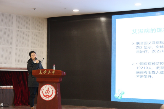 于敏为同学们开展了防艾知识专题讲座。于敏医生从多年工作经历出发,详细地向同学们介绍了艾滋病的症状、病因、就医、治疗、日常和预防,带领大家从科学角度正确认识艾滋和预防艾滋。