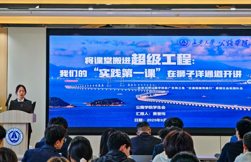 长安大学赴广东珠三角“交通强国筑路行”暑期社会实践队黄誉玮同学以《将课堂搬进超级工程:我们的“实践第一课”在狮子洋通道开讲》为题进行分享。今年暑期,该支队伍走进拥有世界五项第一的狮子洋通道等国家重大工程,深刻感悟到当年青年应勇于在艰难险阻中挑起重担,在祖国最需要的地方挥洒青春。