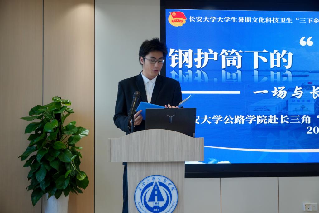 长安大学赴长三角“交通强国筑路行”暑期社会实践队相欣宇同学带来了题为《钢护筒下的“定海神针”:一场与长江的硬核对话》的分享,讲述了张靖皋长江大桥的建设故事。张靖皋长江大桥凭借技术创新创下六项世界纪录,成为世界悬索桥技术的新巅峰,更是一代代建设者们用汗水和智慧连接过去与未来、沟通梦想与现实的象征。