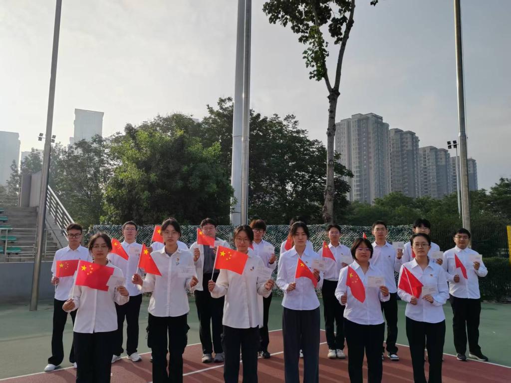 清晨7时,朝晖运动场晨光微露,支部成员整齐列队。随着《义勇军进行曲》激昂奏响,五星红旗冉冉升起,全体党员肃立行注目礼,齐声高唱国歌。嘹亮的歌声回荡在运动场上空,每位党员以庄重姿态向伟大祖国致以崇高敬意。